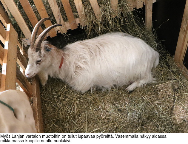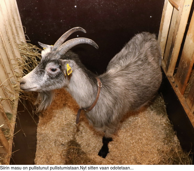 Nyt meillä on maitotalous vanhan 11v Lumikin varassa. Lypsän sen aamuisin ja saan maitoa 6 dl. Välillä se nostaa takajalkaa siihen malliin, kuin haluaisi sillä kertoa, ettei lypsyhomma miellytä. Puhun sille aina kauniisti ja vakavasti, miten se on meidän ainoa lypsävä ja tärkeä pikku lehmä. Nyt viime aikoina on herännyt epäilys, olisiko pikku Antero tehnyt temput myös Lumikin kanssa. Lumikilla on kyllä luonnostaan melkoisen iso mahan möllykkä, joten ainoastaan aika selvittää, onko siellä muutakin kuin papanoita.