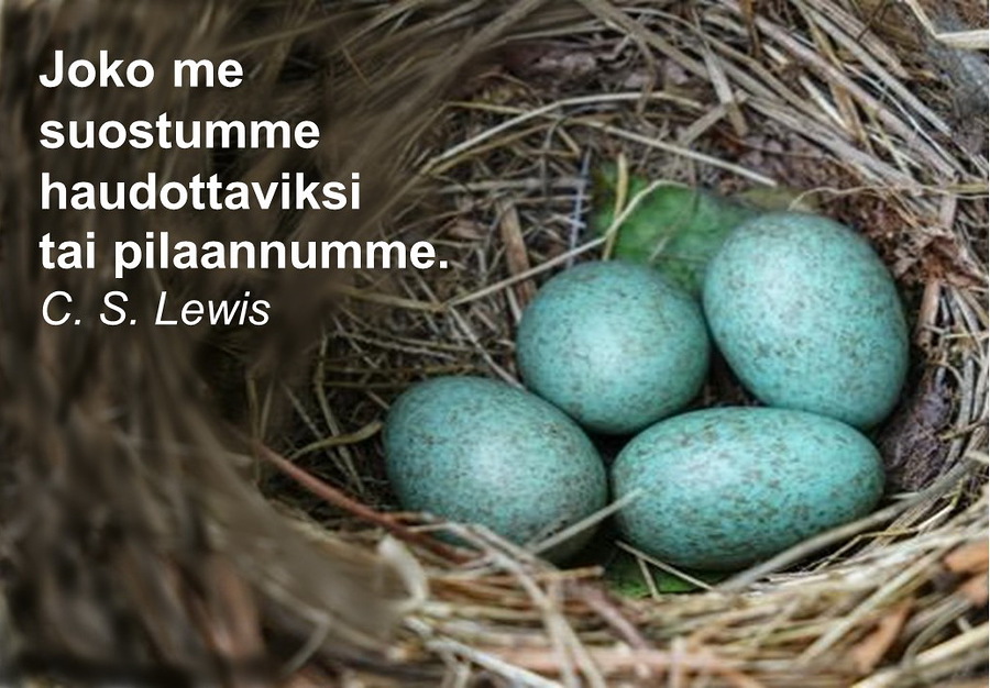 Ihminen on kuin muna, sanoo C.S. Lewis jatkaen toteamalla, että munalle olisi vaikeaa muuttua omin päin linnuksi. Vielä vaikeampaa munalle olisi munana ollessaan oppia lentämään. Muutos on välttämätön. Ilman sitä jäljelle jää vain mädäntynyt muna.