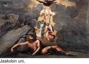 Yöllä Jaakob näki unessa portaat, jotka ulottuivat maasta taivaaseen, ja Jumalan enkelit kulkivat niitä ylös ja alas. Sitten hän näki, että Herra seisoi hänen vieressään ja sanoi: "Minä olen Herra, isäsi Abrahamin Jumala ja Iisakin Jumala. Tämän maan, jolla sinä makaat, minä annan sinulle ja sinun jälkeläisillesi. Sinun jälkeläisesi tulevat lukuisiksi kuin maan tomuhiukkaset, ja sinun sukusi levittäytyy länteen ja itään, pohjoiseen ja etelään. Sinun ja sinun jälkeläistesi saama siunaus tulee siunaukseksi kaikille maailman kansoille. Minä olen sinun kanssasi ja varjelen sinua, minne ikinä menetkin, ja tuon sinut takaisin tähän maahan. Minä en hylkää sinua, vaan täytän sen, minkä nyt olen sinulle luvannut." (1.Moos.28:12-15)
