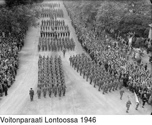 - Seuraavina marssisivat urheat sotilaat, jotka olivat lyöneet Rommelin joukot Afrikassa. Heidän perässään marssisivat urheat lentäjät, jotka olivat karkottaneet saksalaiset lentokoneet Englannin yltä, Churchill jatkoi paraatin kuvausta täynnä intoa ja voitonvarmuutta.
