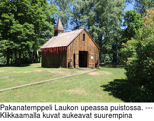 Olimme lastenlasten kanssa kesäretkellä Laukon historiallisessa kartanossa. Ihastelimme upeaa puistoa ja kauniita vanhoja rakennuksia. Tutustuimme päärakennuksen vanhoihin maalauksiin ja paikan värikkääseen historiaan. Viimein tulimme kohteeseen, jolle oli annettu nimi Pakanatemppeli.
