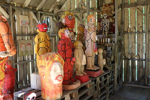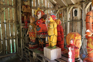 ja räikeästi väritettyjä puupatsaita eri suuntiin sojottavine ja monella tavalla