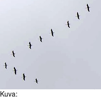 3. opetus: Aurassa taaempana lentävät linnut päästelevät ajoittain kelpo tuuttauksia kannustaakseen edellään lentäviä ja kertoakseen näille, että mukana tullaan ja väsyneitä korvaamaan löytyy uusia innokkaita tuulenhalkojia.