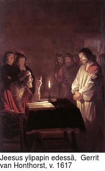 ”Silloin ylipappi sanoi hänelle: ’Minä vannotan sinua elävän Jumalan nimessä: sano meille, oletko sinä Messias, Jumalan Poika.’ ’Itsepä sen sanoit’ , vastasi Jeesus. ’Ja minä sanon teille: vastedes te saatte nähdä Ihmisen Pojan istuvan Voiman oikealla puolella ja tulevan taivaan pilvien päällä.’" (Matt.26:63,64)