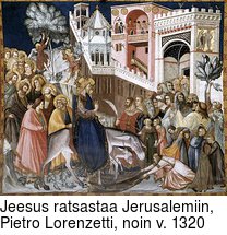 Palmusunnuntain saarnoissa katsellaan Jeesusta, joka ratsastaa kansan hurratessa aasilla Jerusalemiin.
