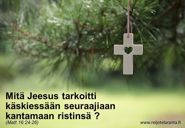 "Jos joku tahtoo kulkea minun jäljessäni, hän kieltäköön itsensä, ottakoon ristinsä ja seuratkoon minua. Sillä se, joka tahtoo pelastaa elämänsä, kadottaa sen, mutta joka elämänsä minun tähteni kadottaa, on sen löytävä. Mitä hyödyttää ihmistä, jos hän voittaa omakseen koko maailman mutta menettää sielunsa (Matt.16:24-26)