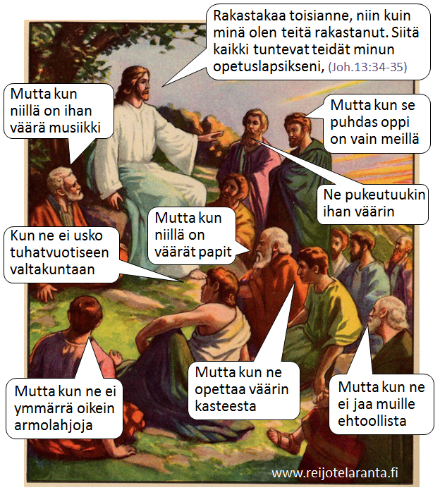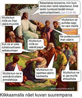 ”Minä annan teille uuden käskyn: rakastakaa toisianne! Niin kuin minä olen rakastanut teitä, rakastakaa tekin toinen toistanne. Kaikki tuntevat teidät minun opetuslapsikseni, jos te rakastatte toisianne." (Joh.13:34-35)