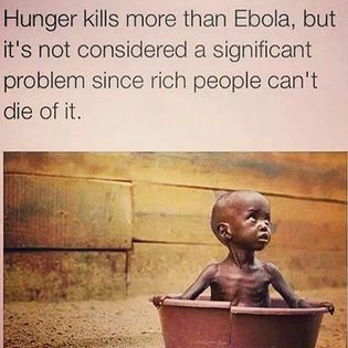 Näin oheisen kuvan Facebookissa. Kuvassa pieni lapsi istu apua anovana rikkinäisessä astiassa. Yläpuolella on viiltävän paljastava teksti: ”Nälkä tappaa enemmän kuin Ebola, mutta sitä ei pidetä merkittävänä ongelmana, koska rikkaat eivät kuole siihen.”