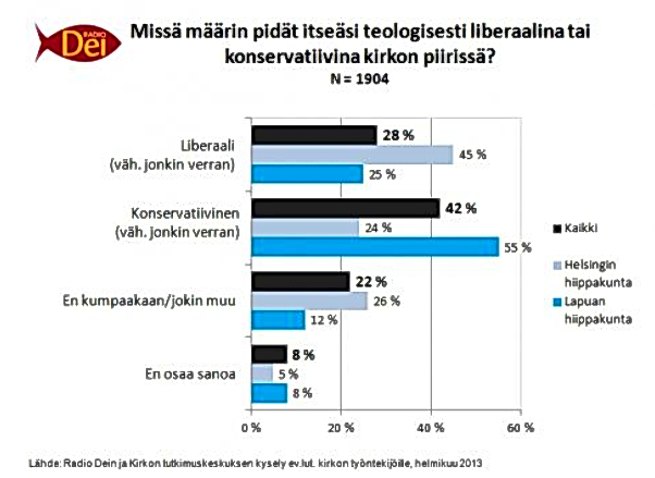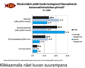 Konservatiiveiksi tai liberaaleiksi itsensä mieltäviä on tutkimuksen mukaan suunnilleen saman verran. Kummallakaan ei ole hallitsevaa asemaa seurakunnissa tai muutoin kirkon tehtävissä työskentelevien joukossa. Opillisissa kysymyksissä erot ovat selvät ja pikemminkin jyrkkenevät kuin tasoittuvat.