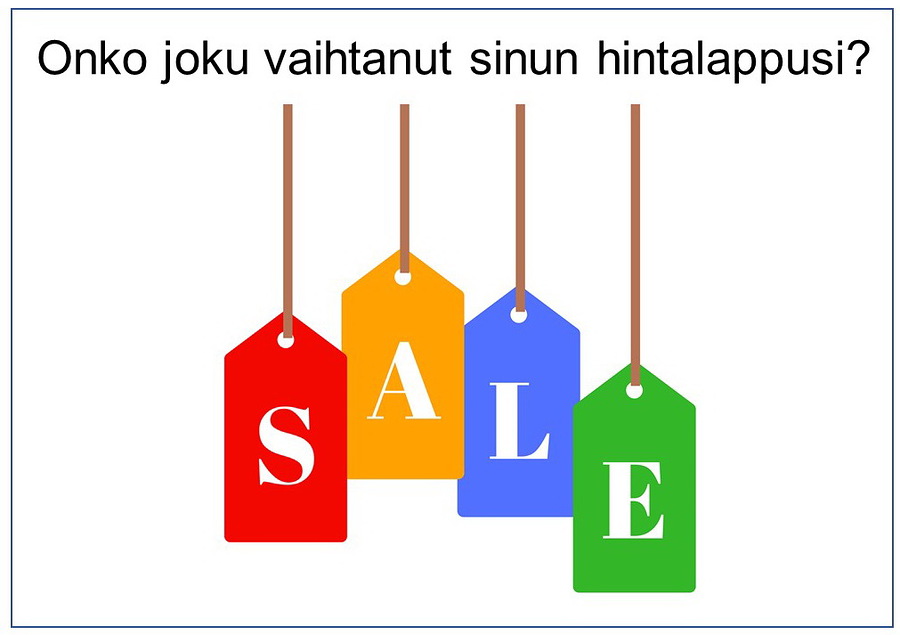 Raamattu kertoo, että jokainen ihminen on arvokas, äärettömän arvokas. Jeesus on maksanut meistä jokaisesta kalleimman mahdollisen hinnan - kärsimyksensä, verensä ja kuolemansa. Tämä jumalallinen hinnoittelu koskee juuri sinua riippumatta siitä, mitä muut sinusta ajattelevat tai kuinka he sinut hinnoittelevat. Jumalan silmissä sinun hintalapussasi oleva summa on Jeesuksen tähden kaikkia maailman rikkauksia ja aarteita suurempi!