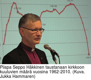 ”Sisäisesti maallistunut kirkko kärsii teologisesta heikkoudesta ja hengellisestä anemiasta. Laimennettu sanoma ei ravitse eikä vahvista jäsenyyttä uskonyhteisössä”, piispa Häkkinen totesi erinomaisessa ja ajankohtaisessa alustuksessaan, jossa hän käsitteli laajasti myös kirkkoon kuulumisen ja kastettujen määrän kehitystä viime vuosikymmeninä.
