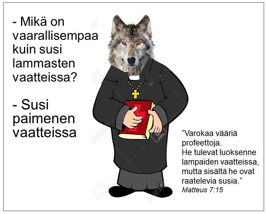 Minä tiedän, että lähtöni jälkeen teidän keskuuteenne tulee julmia susia, jotka eivät säästä laumaa. Teidän omasta joukostanne nousee miehiä, jotka julistavat totuudenvastaisia oppeja vetääkseen opetuslapset mukaansa. Olkaa siis valveilla ja muistakaa, että minä kolmen vuoden ajan olen lakkaamatta, yötä päivää kyynelsilmin opastanut itse kutakin teistä. (Ap.t.20:28-31)