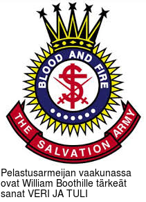 Veri ja tuli olivat William Boothille niin tärkeitä, että hän liitti sanat Pelastusarmeijan vaakunaan. Ilman Jeesuksen syntiemme sovitukseksi vuodattamaa verta meillä ei ole pelastusta. Ilman Jeesuksen seuraajille luvattua Pyhää Henkeä Jeesuksen seuraajien seurakunta on voimaton ja tämän maailman tuulten heiteltävissä.