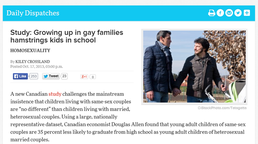 Teksasin yliopiston professori Mark Regnerus julkaisi viime vuonna tutkimuksen, jonka mukaan samaa sukupuolta olevien vanhempien lapsilla on selkeästi korkeampi todennäköisyys joutua yhteiskunnan tukijärjestelmien asiakkaaksi, syyllistyä rikoksiin, joutua raiskauksen kohteeksi ja kärsiä masennuksesta kuin miehen ja naisen välisen avioliiton suojissa kasvaneilla lapsilla.