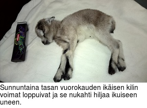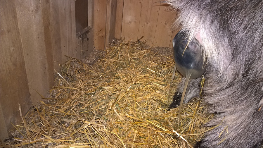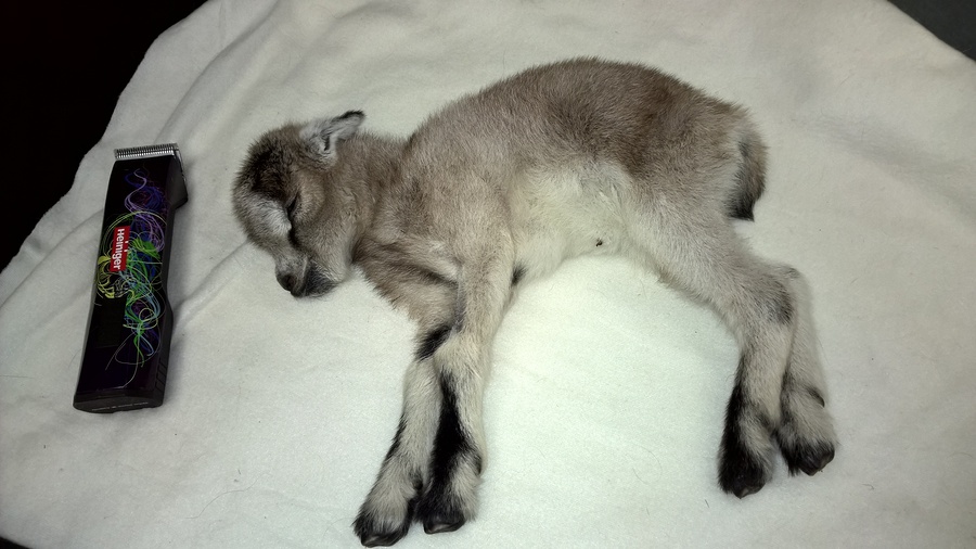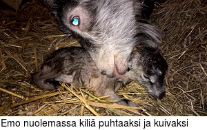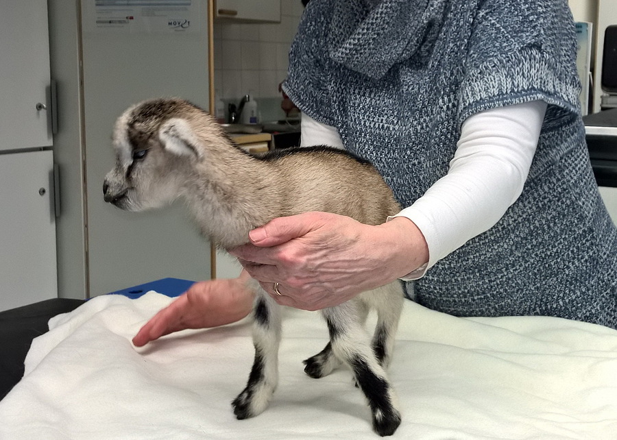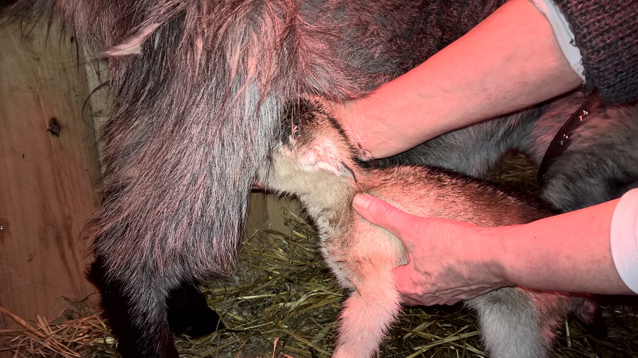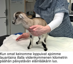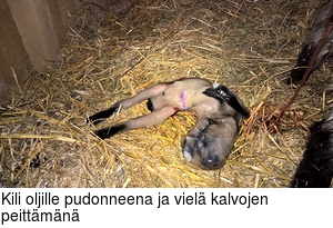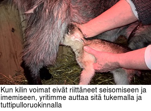 Kili oli liian heikko noustakseen jaloilleen ja jaksaakseen imeä emon maitoa. Yritimme ruokkia sitä emosta lypsetyllä maidolla käyttäen tuttipulloa ja lusikaa. Kun tilanne vain paheni, kävimme illalla viidenkymmenen kilometrin päässä Mouhijärvellä päivystävän eläinlääkärin luona. Hän antoi vahvistavia pistoksia ja syötti kiliä letkulla suoraan mahaan.